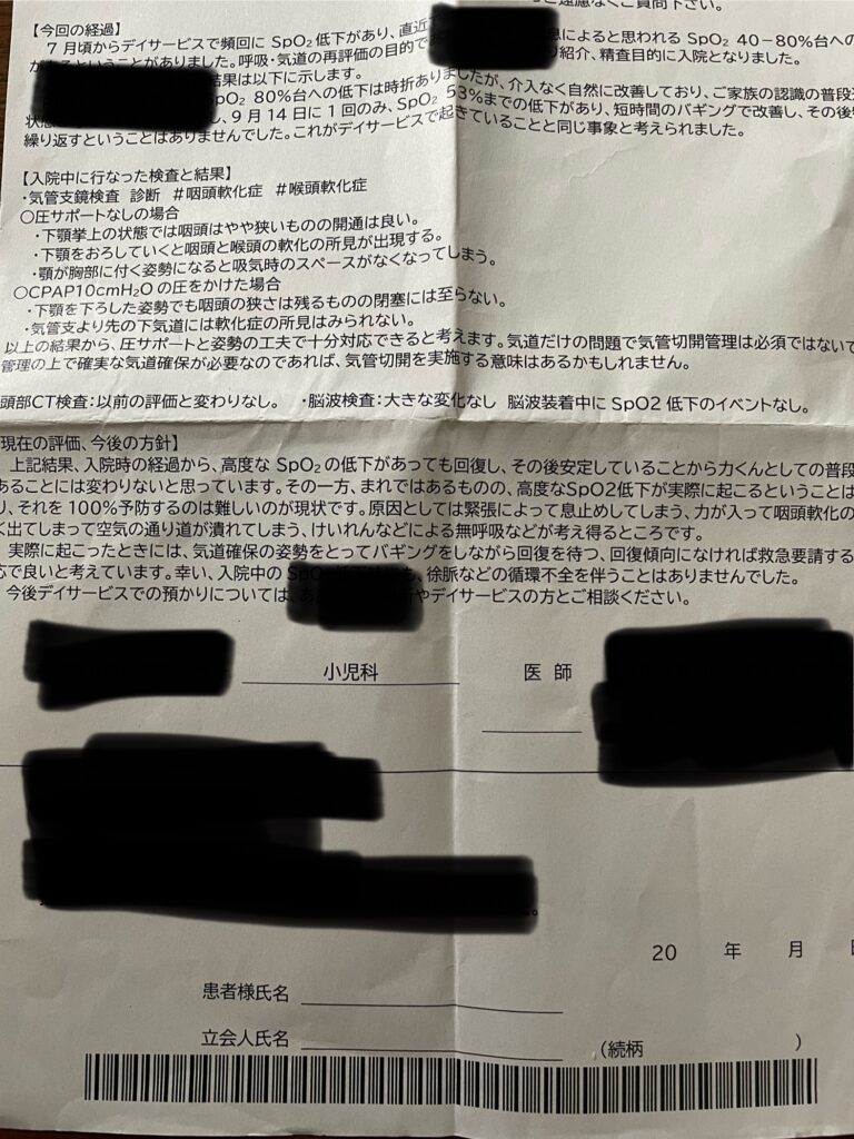 先生から言われたのは、なるべく気道が狭くならないように肩枕をしたり、デイサービスの間はお風呂以外では呼吸器を外さないなど…